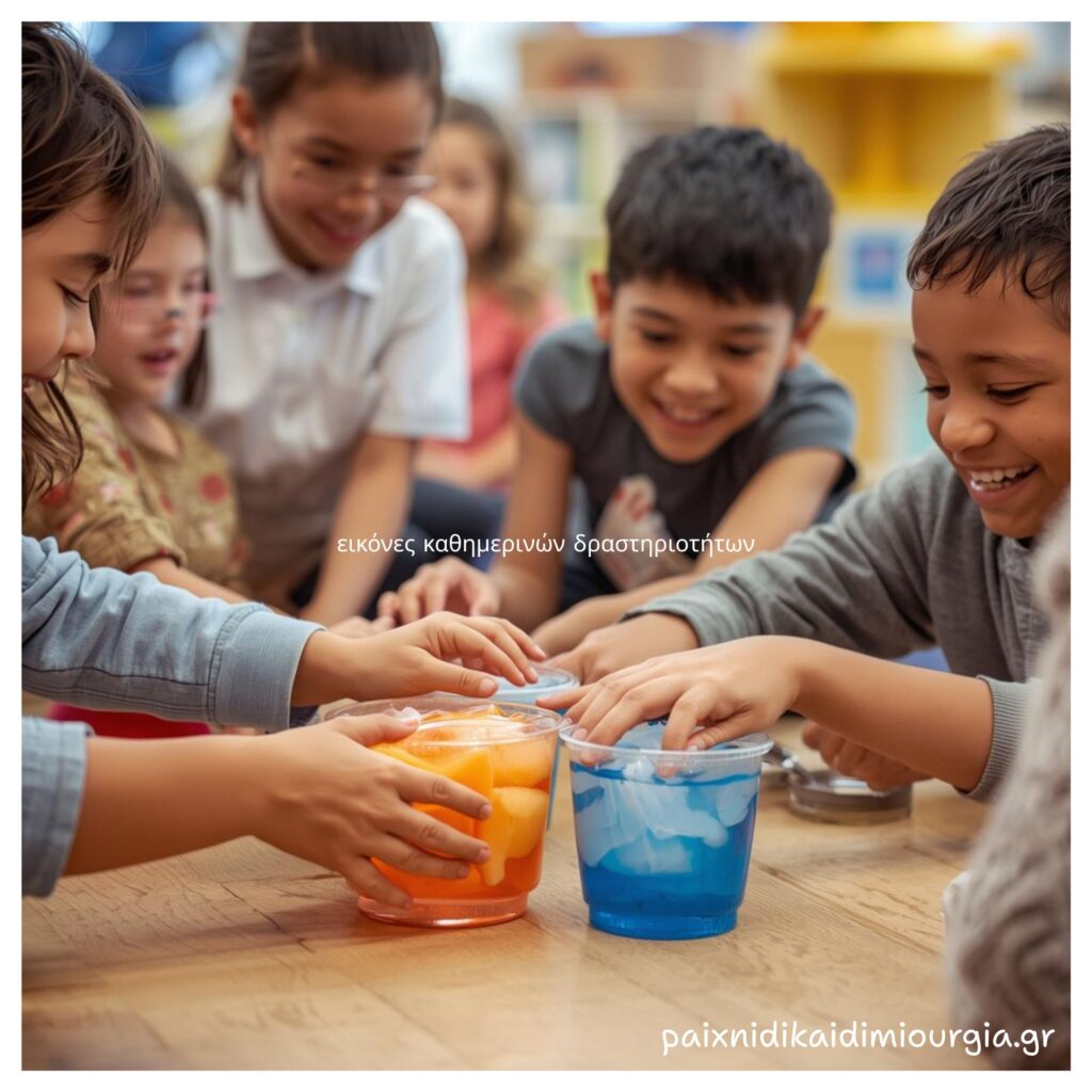 Τα παιδιά ζωγραφίζουν με παγωμένα χρώματα, παρατηρώντας πώς αλλάζει η υφή και η θερμοκρασία.
