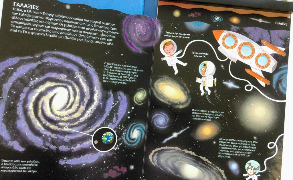 Στο βιβλίο Ταξίδι στο Διάστημα, παρέα με την Άλι, τον αδελφό της Όλι και το σκύλο τους Γούφερ που θέλουν να γίνουν αστροναύτες και λατρεύουν να μαθαίνουν για το διάστημα, κάνεις ένα υπέροχο ταξίδι στα πέρατα του Γαλαξία.