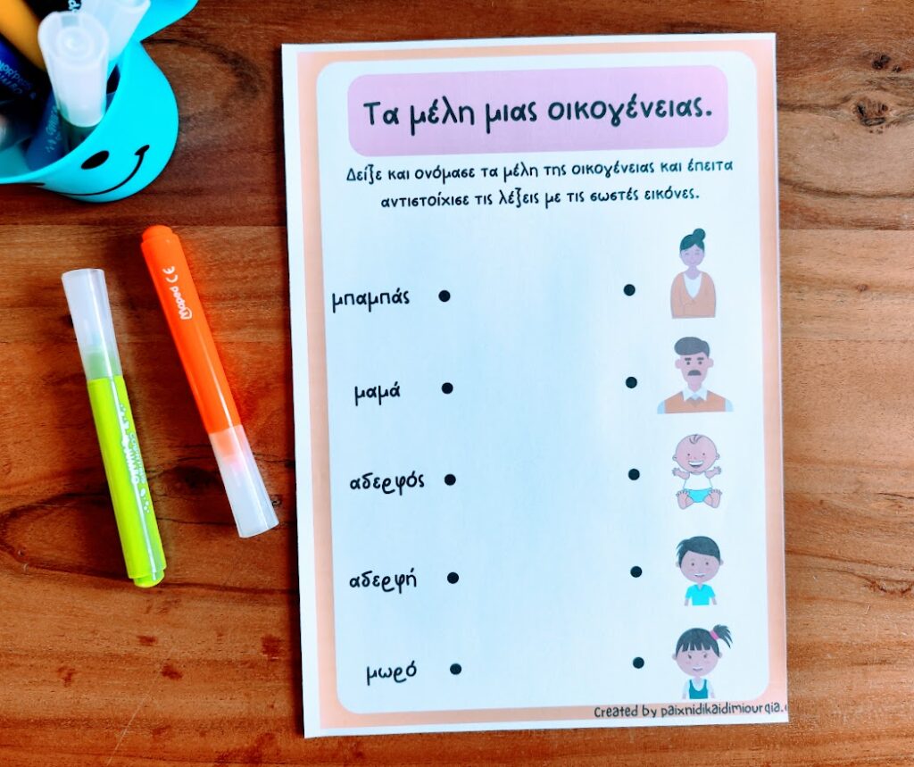 Ζωγραφίζουν ή κολλάνε φωτογραφίες στα κενά σημεία και γράφουν στο κάτω μέρος το όνομα του κάθε μέλους. Στη συνέχεια τα παιδιά φέρνουν την εργασία στο σχολείο και μας συστήνουν την οικογένειά τους.