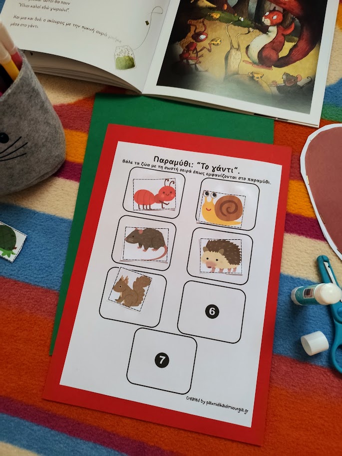 Το πρώτο ζώο που ανακαλύπτει το γάντι είναι ένα μυρμήγκι. Μικρό και εργατικό, ψάχνει προστασία. Μπαίνει μέσα και βρίσκει ζεστασιά.